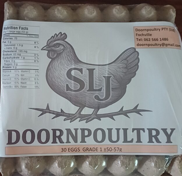 Fresh, high-quality farm eggs from Doornpoultry, carefully packed in a branded 30-egg tray and securely shrinkwrapped for protection and freshness. Our eggs are produced by healthy, well-cared-for hens and graded to ensure consistent size, strong shells, and excellent taste.